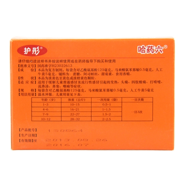 | 成份 | 本品为复方制剂,每袋含对乙酰氨基酚125毫克,马来酸氯苯那敏0.5毫克,人工牛黄5毫克。辅料为:蔗糖、阿司帕坦、甜菊素、食用香精 |