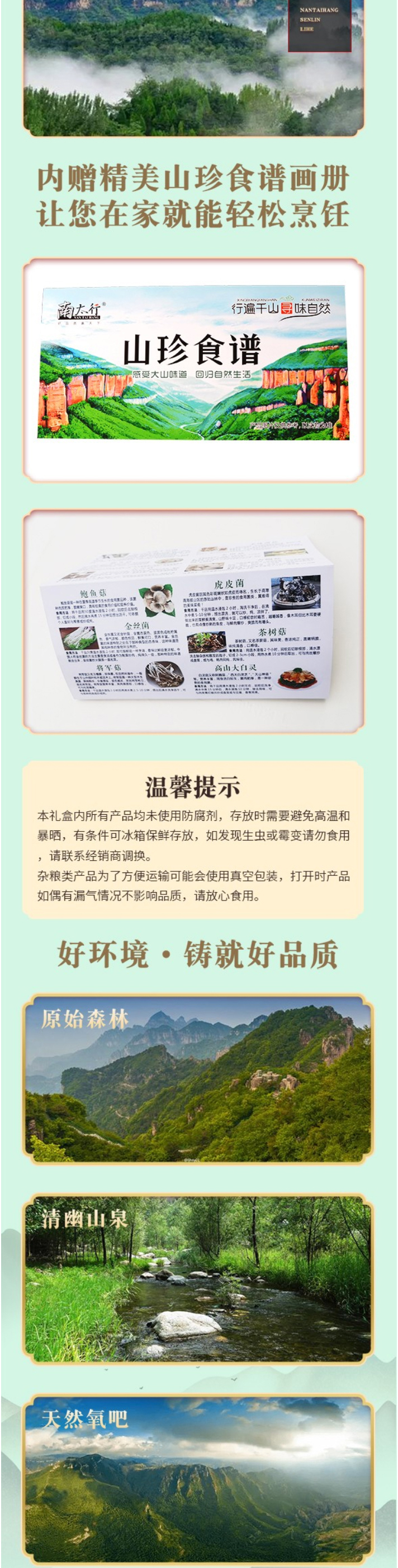 内含: "黑灵芝35克 赤松茸45克 蛹虫草60克 白玉耳50克 鹿茸菇35克 猴头菇40克 黑木耳70克 金钱菇50克 黑豆300克 黑米350克"