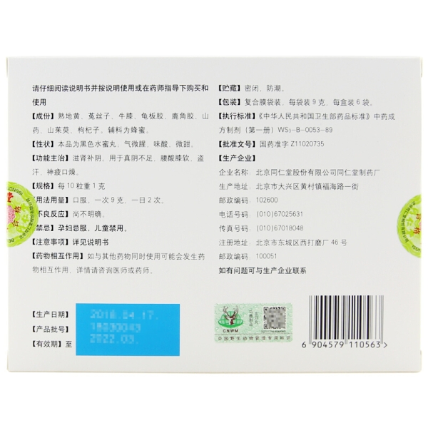 同仁堂 左归丸 9g*6袋 滋阴补肾