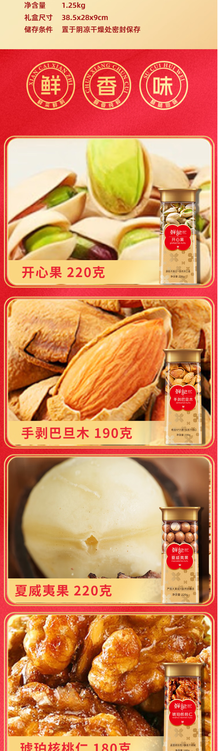 "开心果220g 手剥巴旦木190g 夏威夷果220g 小白杏核240g 开口榛子200g 琥珀核桃仁180g"