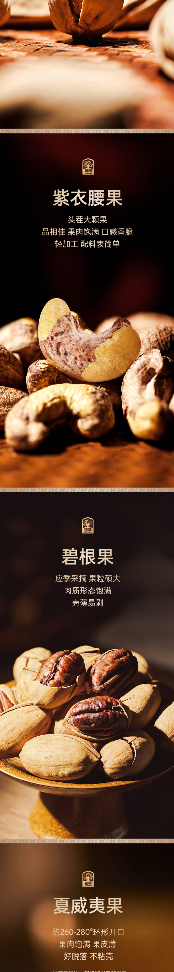 内含: 100g原色开心果*1 100g紫衣腰果*2 100gNP巴旦木*2 100g碧根果*2 100g开口榛子*2 200g夏威夷果*2"