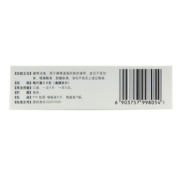 | 适应症|功效 | 健胃消食。用于脾胃虚弱所致的食积,症见不思饮食,嗳腐酸臭、脘腹胀满,消化不良见上述症候者。 |